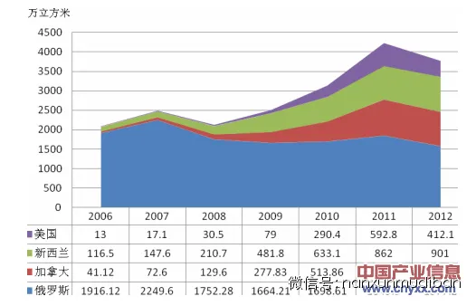 在针叶木材方面,2006至2012年间,虽然来自俄罗斯的针叶木材出口量在下降,但供应缺口迅速被加拿大、新西兰等欧美木材出口国的新增出口予以弥补。供给来源的多元化为我国木材原料的进口提供了更好的市场环境。