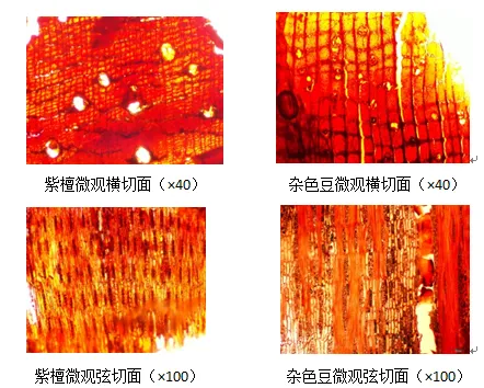 木材微观特征:散孔材。多数单管孔,少数2-4个径列复管孔;导管内具深色树胶。导管单穿孔,管间纹孔式互列,附物纹孔。导管与射线间纹孔式类似管间纹孔式。轴向薄壁组织带状,含深色内含物,宽3-5个细胞。木射线非叠生,少数近叠生,主为双列,单列射线可见;具连接射线,射线高8-20个细胞,较长。射线组织同形单列及多列。