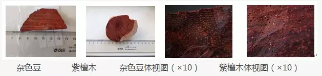 木材宏观特征:心材刚解锯时为砖红,久置于空气中则会变成深紫红色至黑紫红色。心边材区别明显,边材浅黄色,由于边材不耐腐,在砍伐时经常被去掉。木材纹理直或交错;管孔在放大镜下可见。轴向薄壁组织丰富,带状,宽3-5个细胞。木射线放大镜下可见。结构细至甚细;没有明显的气味与滋味。其外观特征与檀香紫檀相近,但两者可以通过水侵泡观察有无蓝色荧光的方式区分开来,方法是杂色豆浸泡的水溶液没有淡蓝色荧光出现,而檀香紫檀有荧光出现。此外,还可以用放大镜观察横断面宏观结构,杂色豆具有较宽的带状薄壁组织,且弦切面无波痕,区别于檀香紫檀,这样就可将两者区分开。